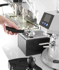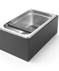 Rahmen aus dunklem Holz, mit einer GN 1/4 Abklopfbox aus Edelstahl.