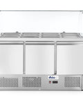 Die Arbeitsplatte bietet Platz für 4x GN 1/1 Behälter (max. Höhe 150 mm) oder eine Kombination aus kleineren GN Behältern.