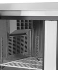 Mit Umluftkühlung mit automatischer Abtauung und seitlich angebrachter Kompressor.