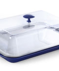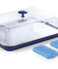 5-teiliges Set: Basis aus Polystyrol, Tablett aus Edelstahl (mit Profilrand), transparente Abdeckung aus Polystyrol, 2 Kühlelemente.